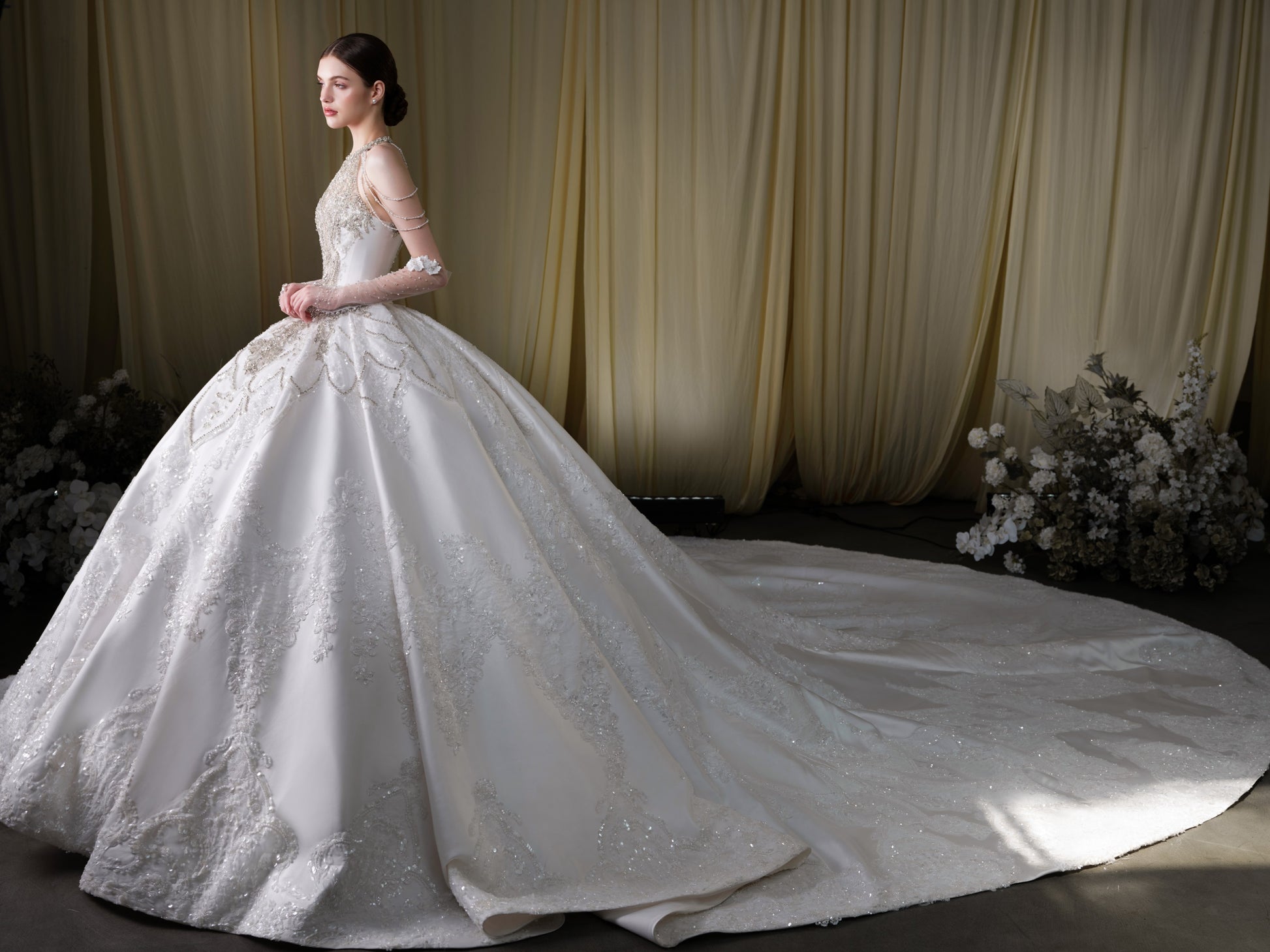A delicate cutout at the chest allows the heavy skirt to breathe,