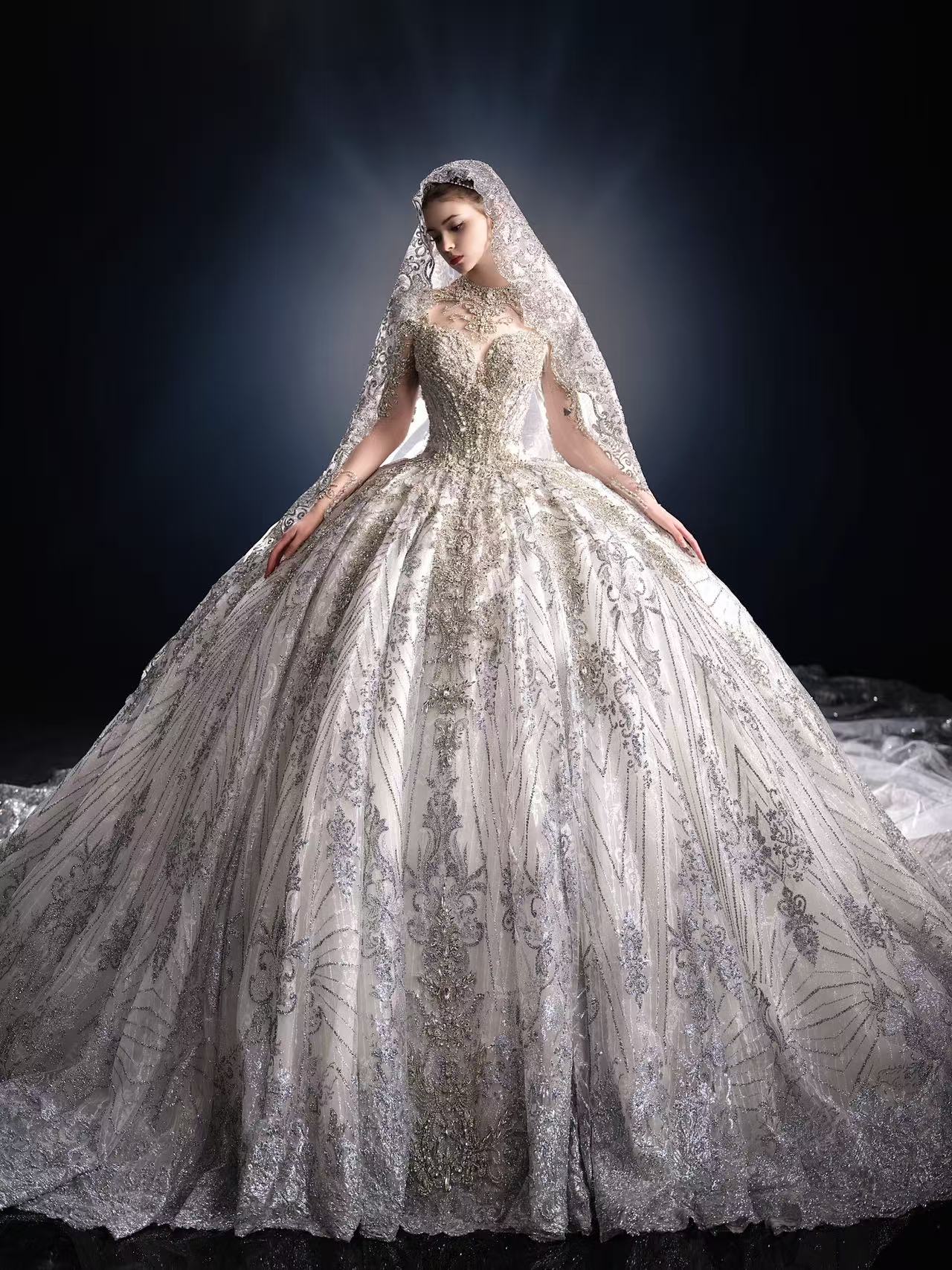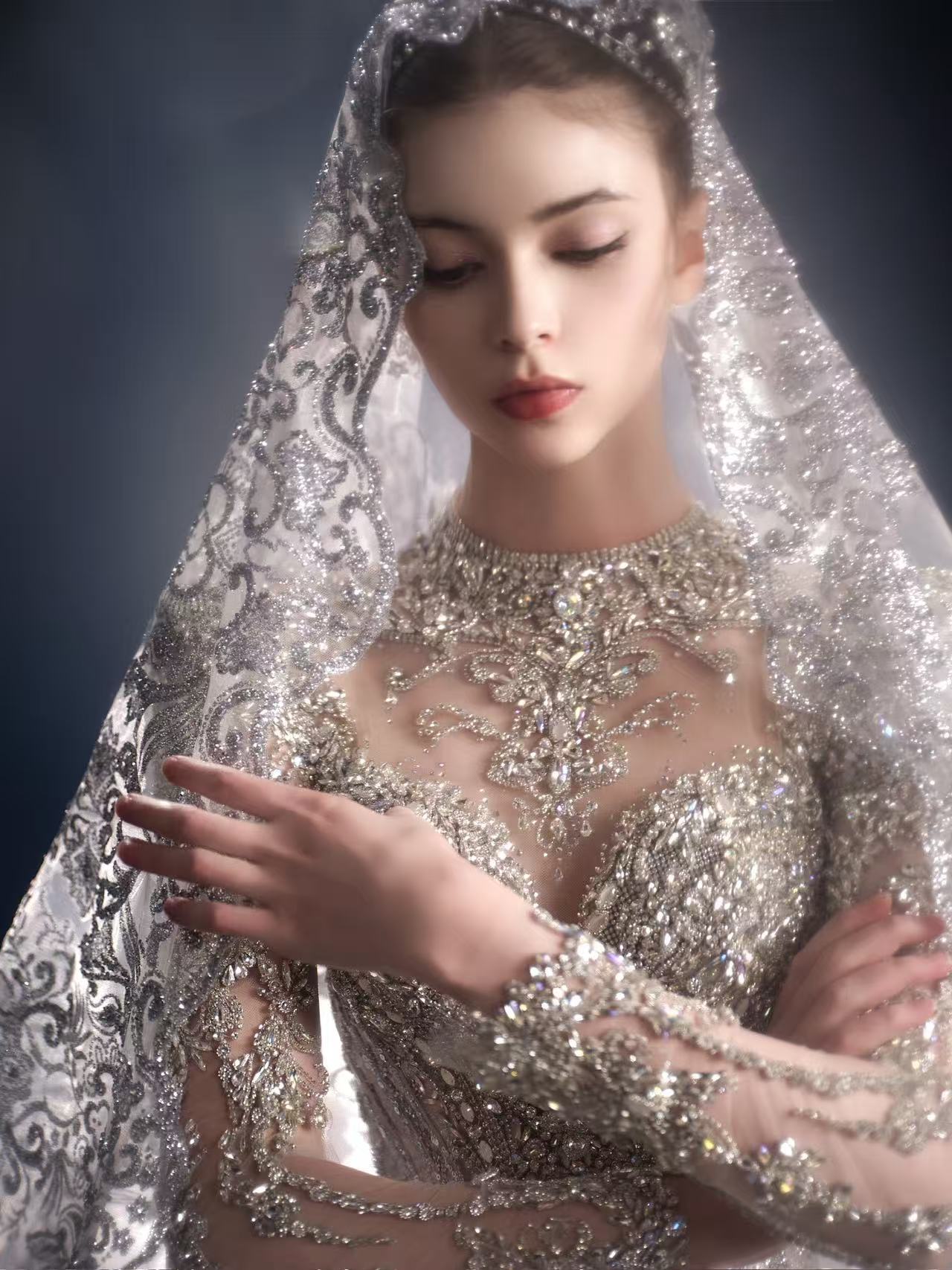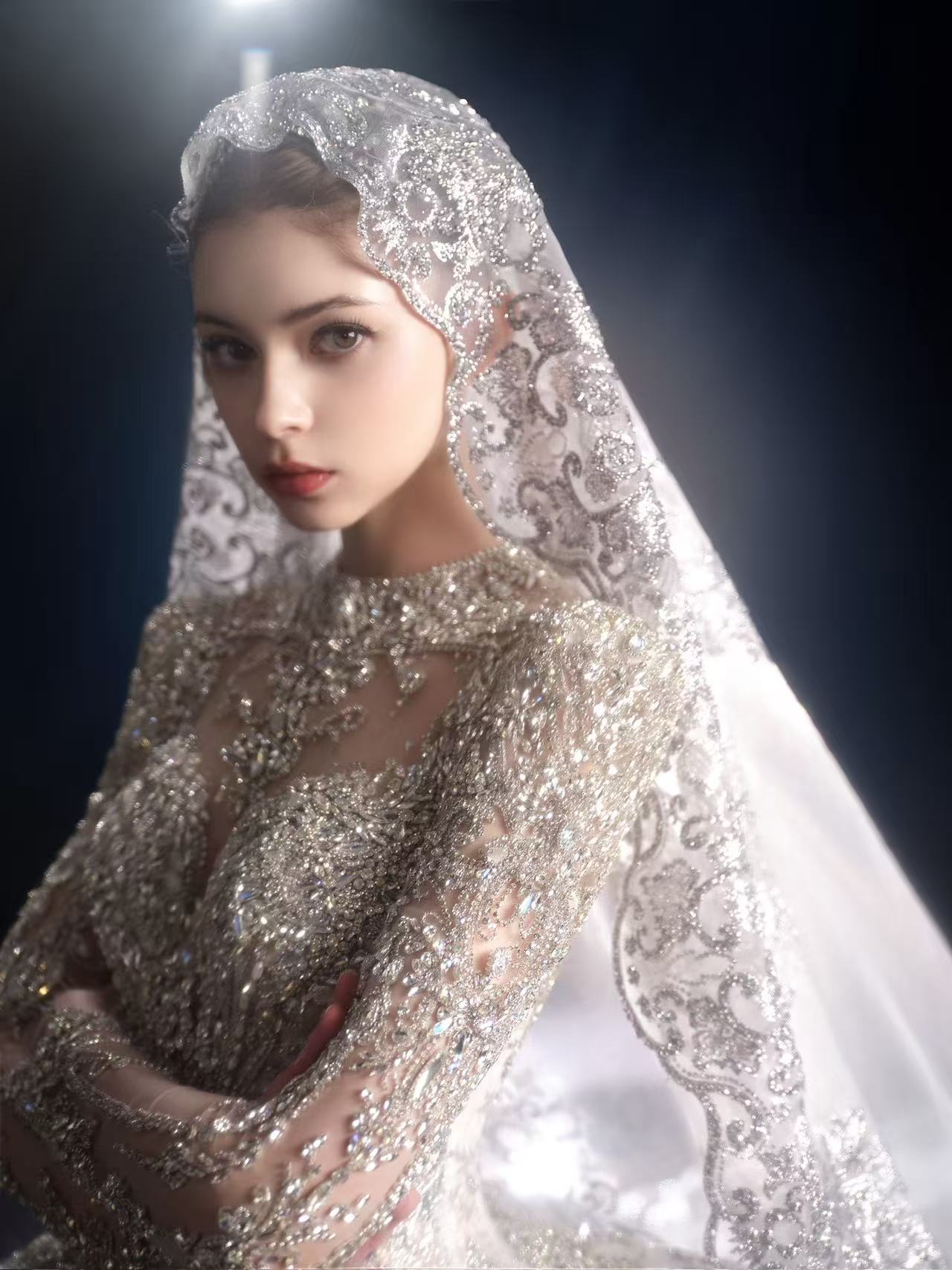 The Aurora Incarnate bridal dress features an exquisite necklace-inspired neckline that elegantly frames the décolletage, adding a touch of refined sophistication. Complemented by a stunning veil, this gown creates a timeless bridal look that combines classic beauty with modern elegance, perfect for making a memorable entrance on your special day.