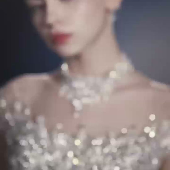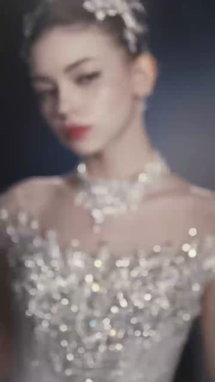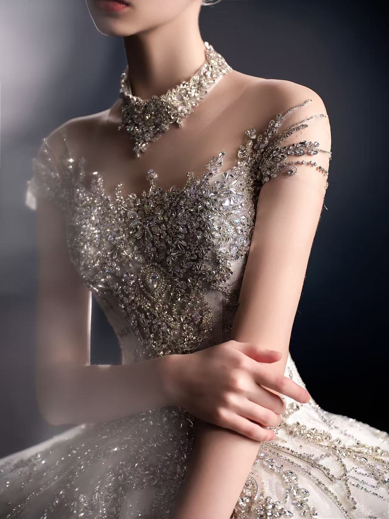 The bodice sparkles with hand-sewn constellations of crystals and sequins 🌟, capturing the light like a galaxy in motion. A structured sweetheart neckline 💫 transitions into sheer illusion sleeves, dusted with shimmering starbursts – as if the night sky wrapped itself around you 🌠.