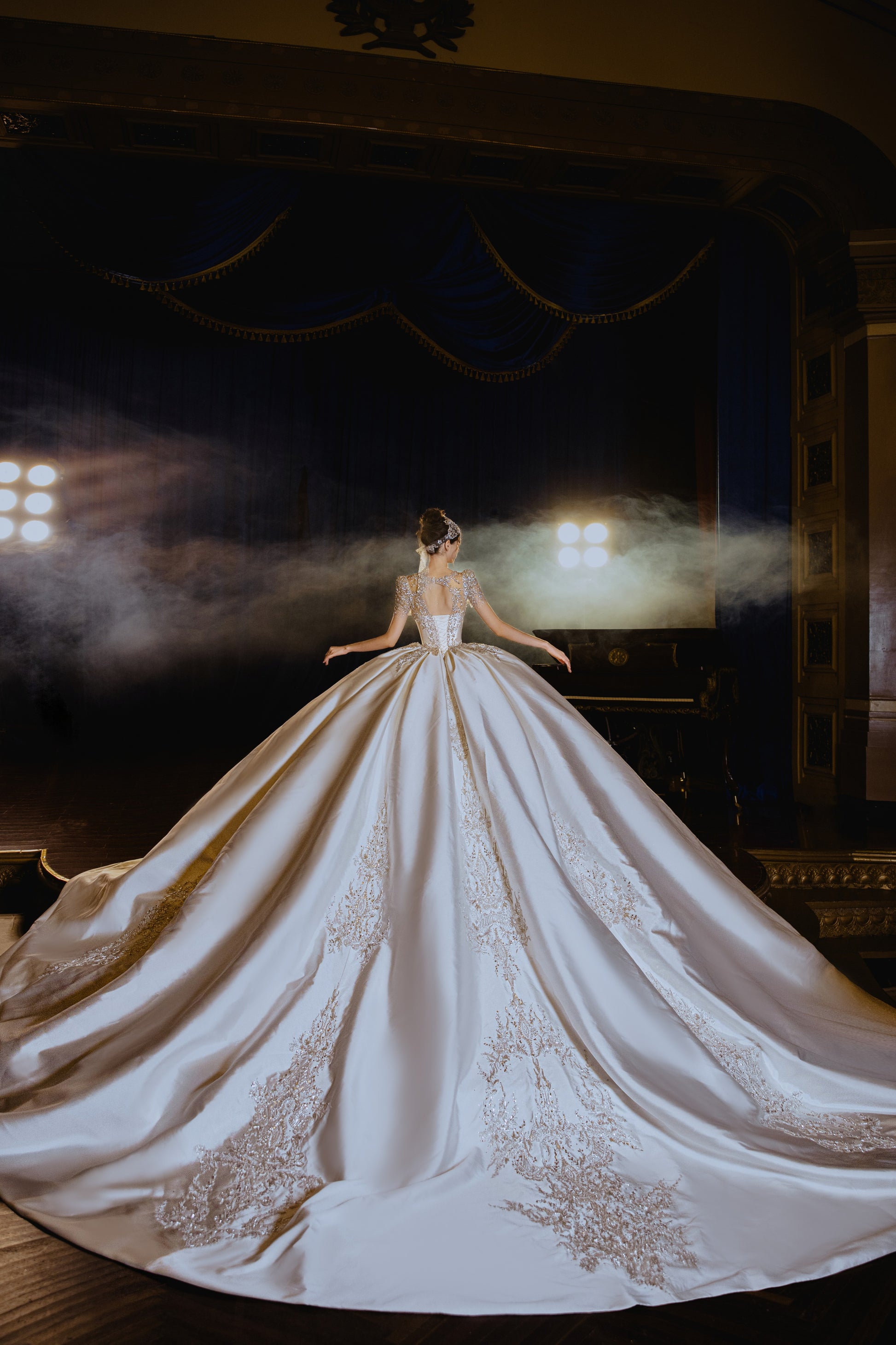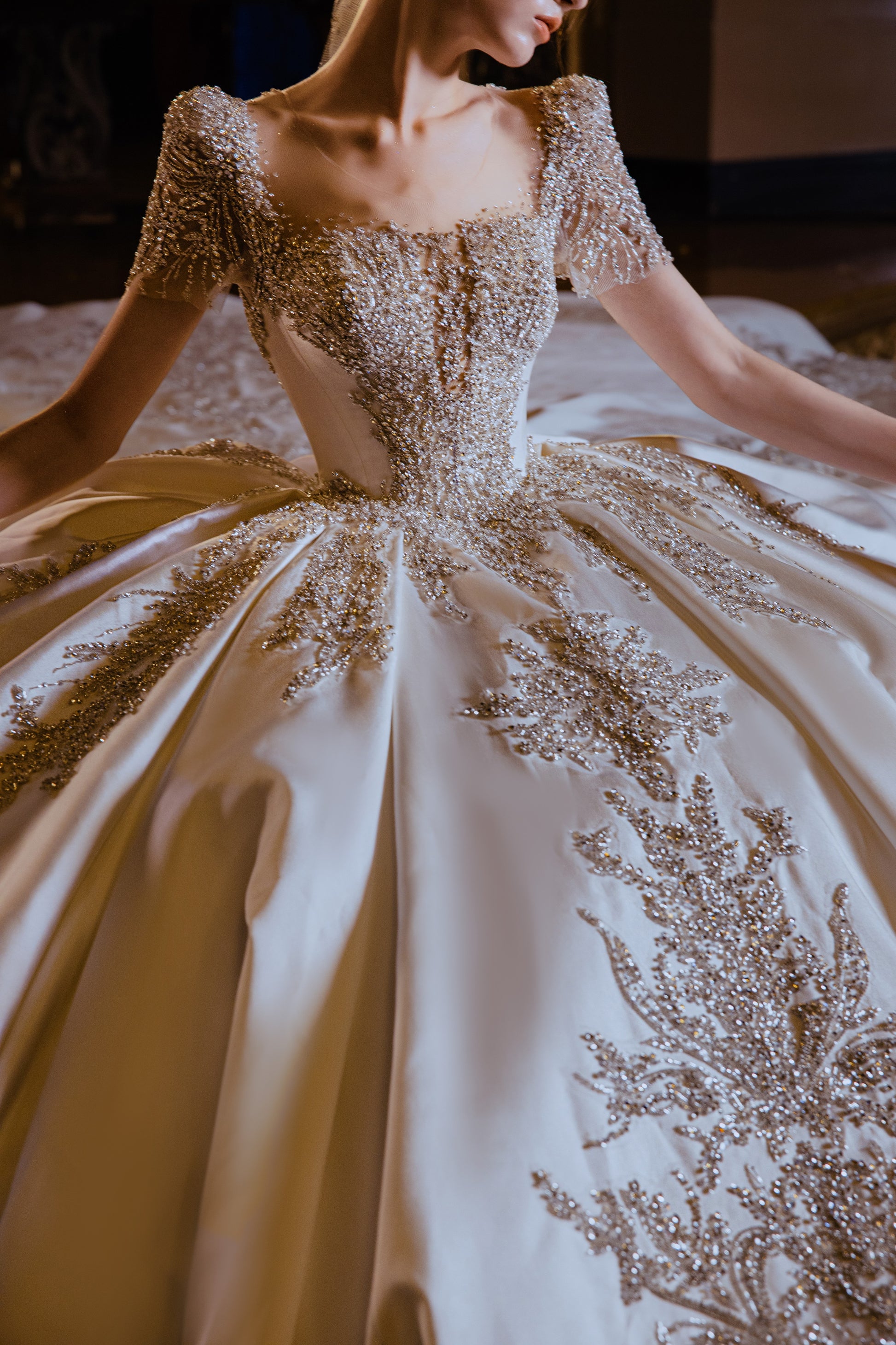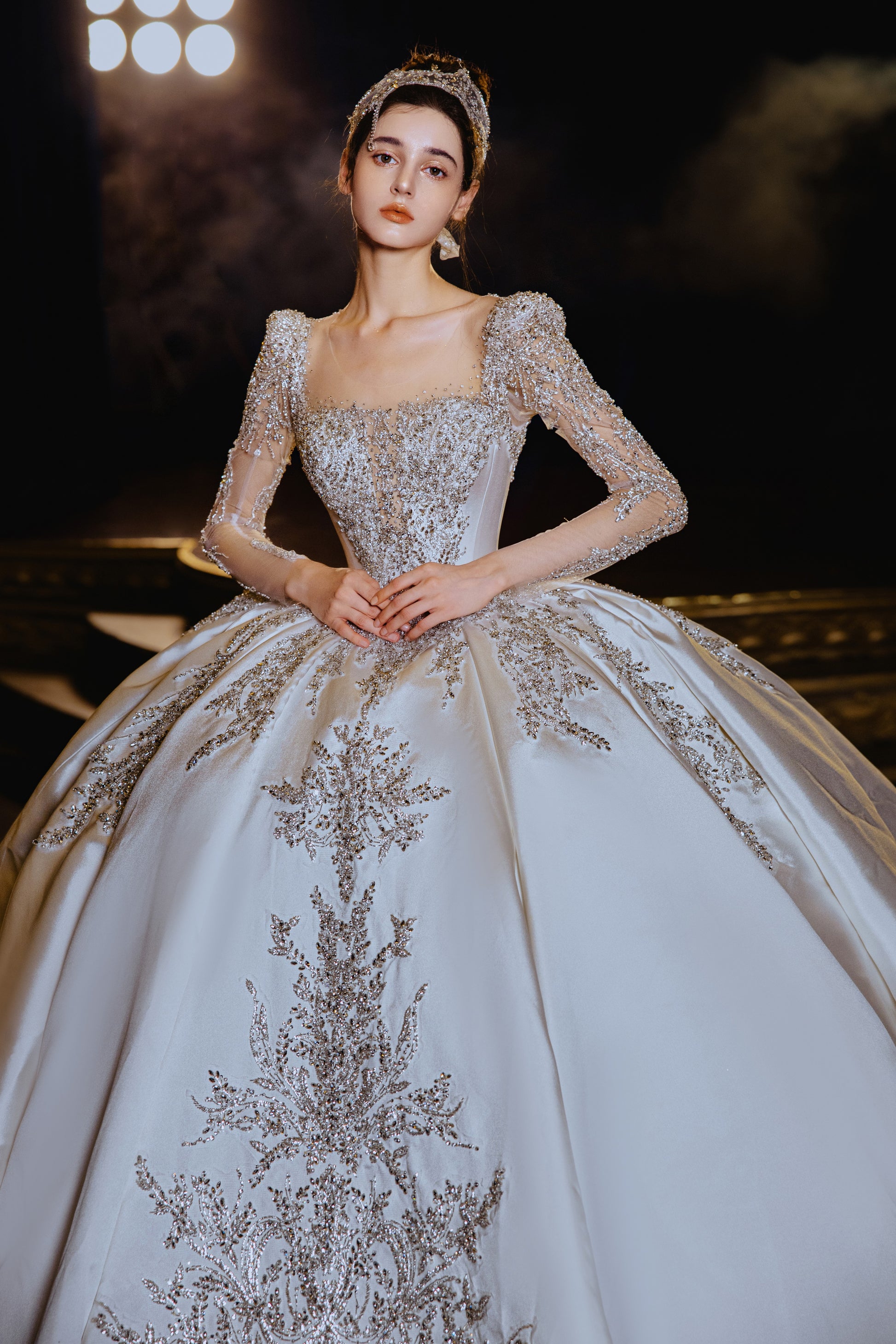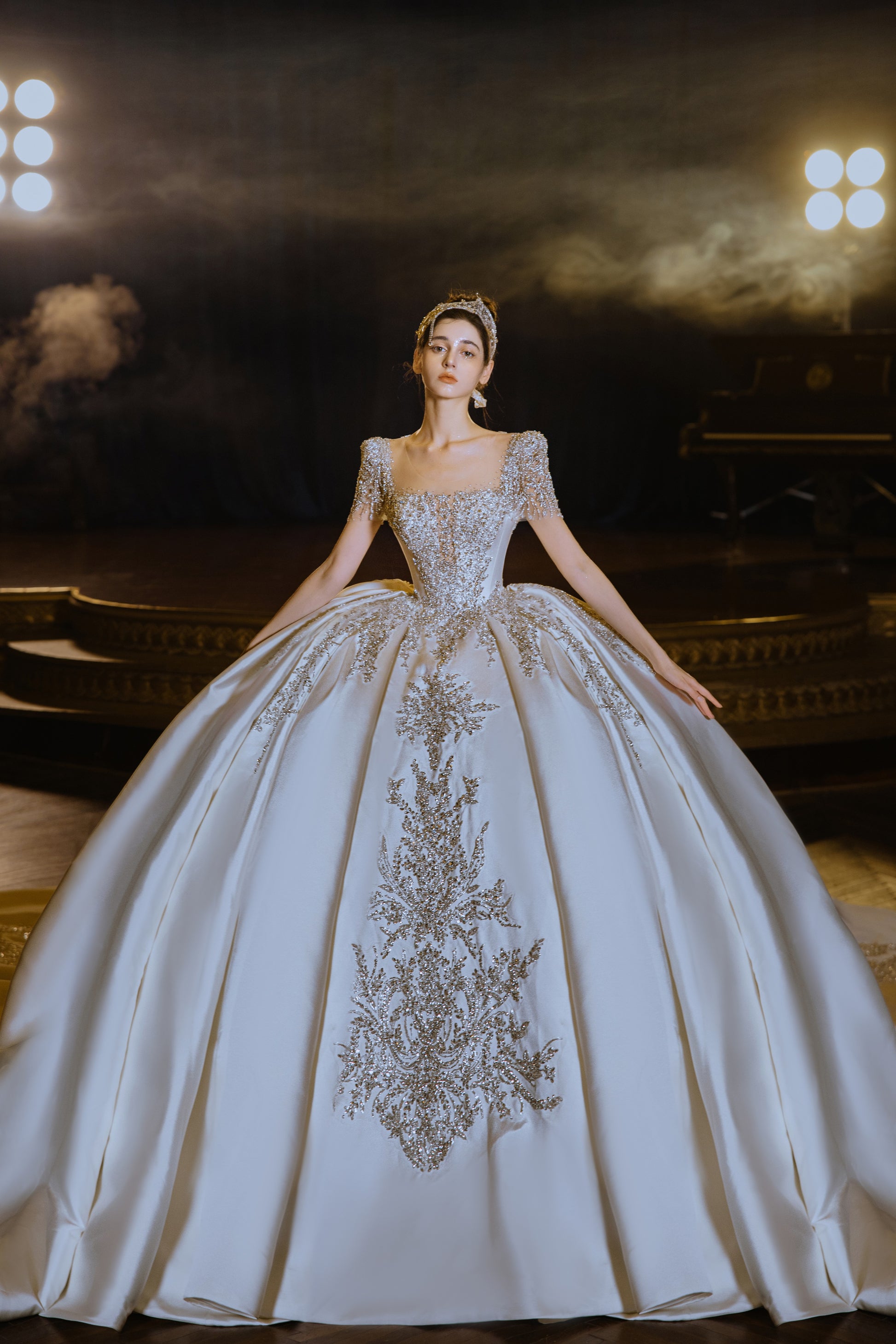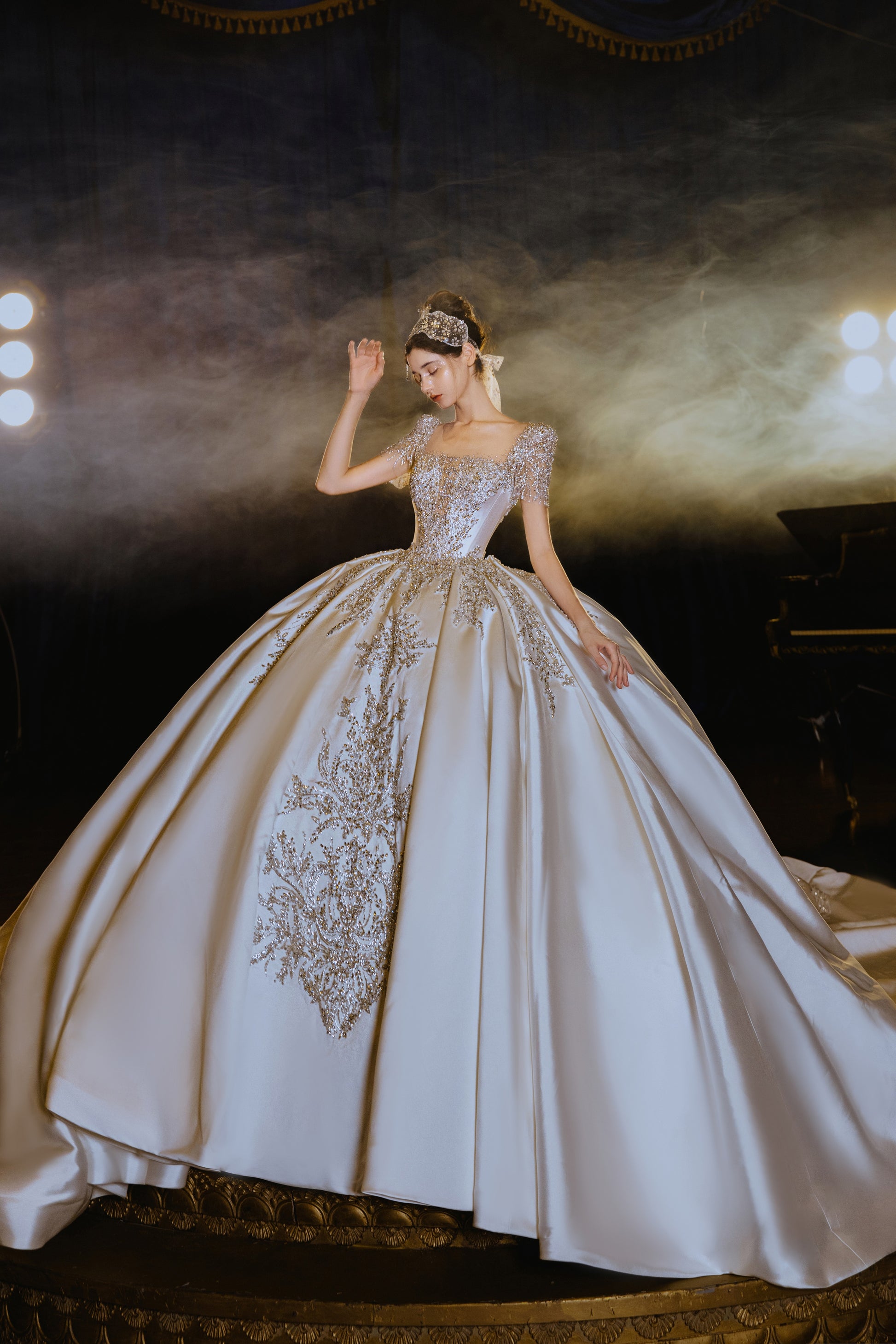 The Moon Goddess bestows blessings of love with moonlight. When satin intertwines with sheer fabric, adding intellectual freshness to elegance and solemnity. When pearls collide with diamonds,modern luxury emerges amidst traditional classicism. A brilliant sea of stars adorns the chest, like the Milky Way encircling, Silky satin flows down at the waist,as if moonlight is pouring down. Gracefully like the moon goddess in mythology, beautiful beyond compare,or possessing an unspeakable sacred mystery.