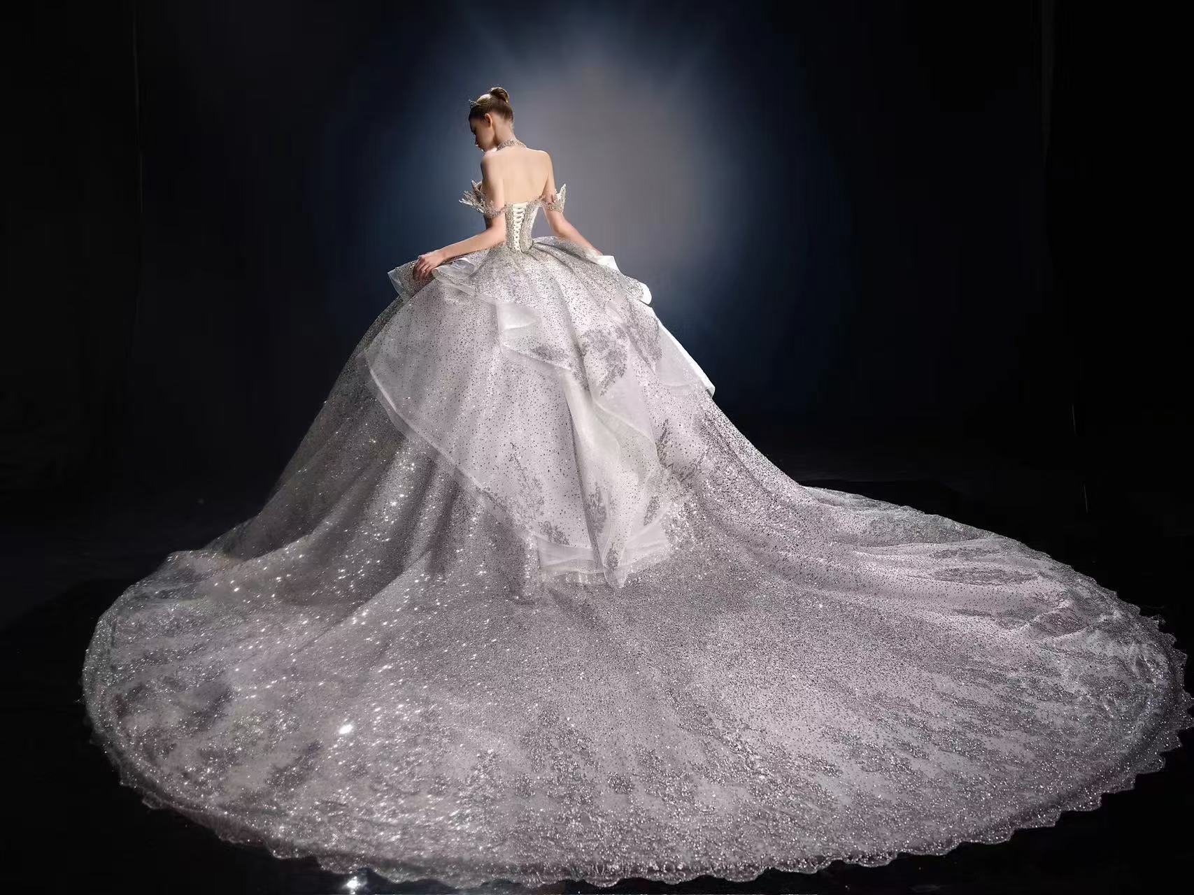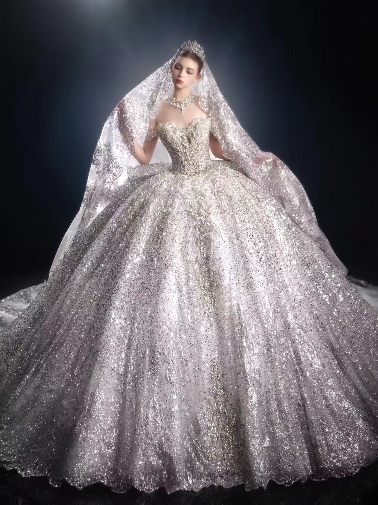 The off-shoulder sweetheart neckline ❤️ flows into a structured, crystal-encrusted bodice 💠 that sparkles with every breath you take. Layers of luminous sequins ✨, silver embroidery 🪡, and couture beadwork dance across the gown, catching the light in a dazzling display.
