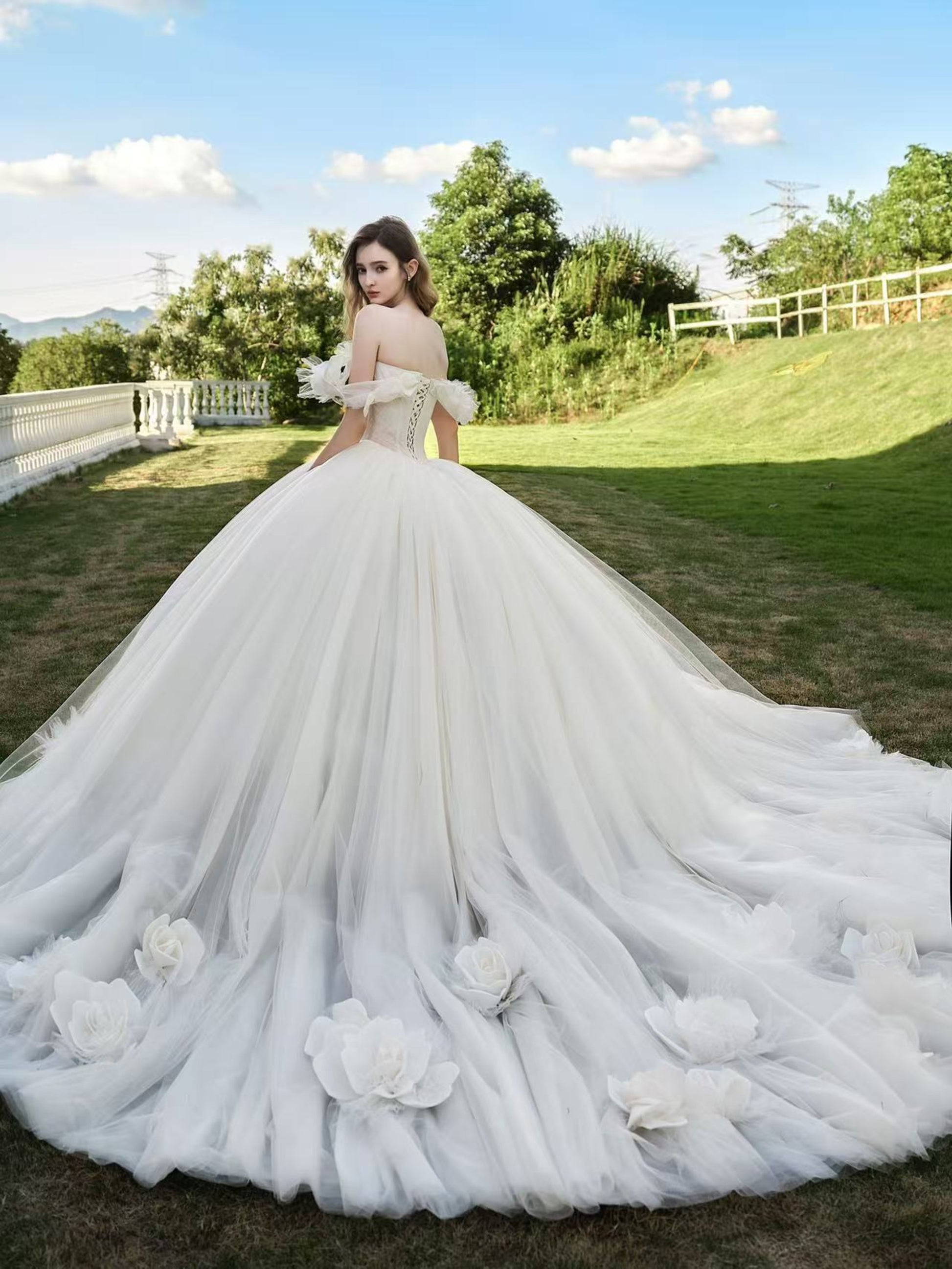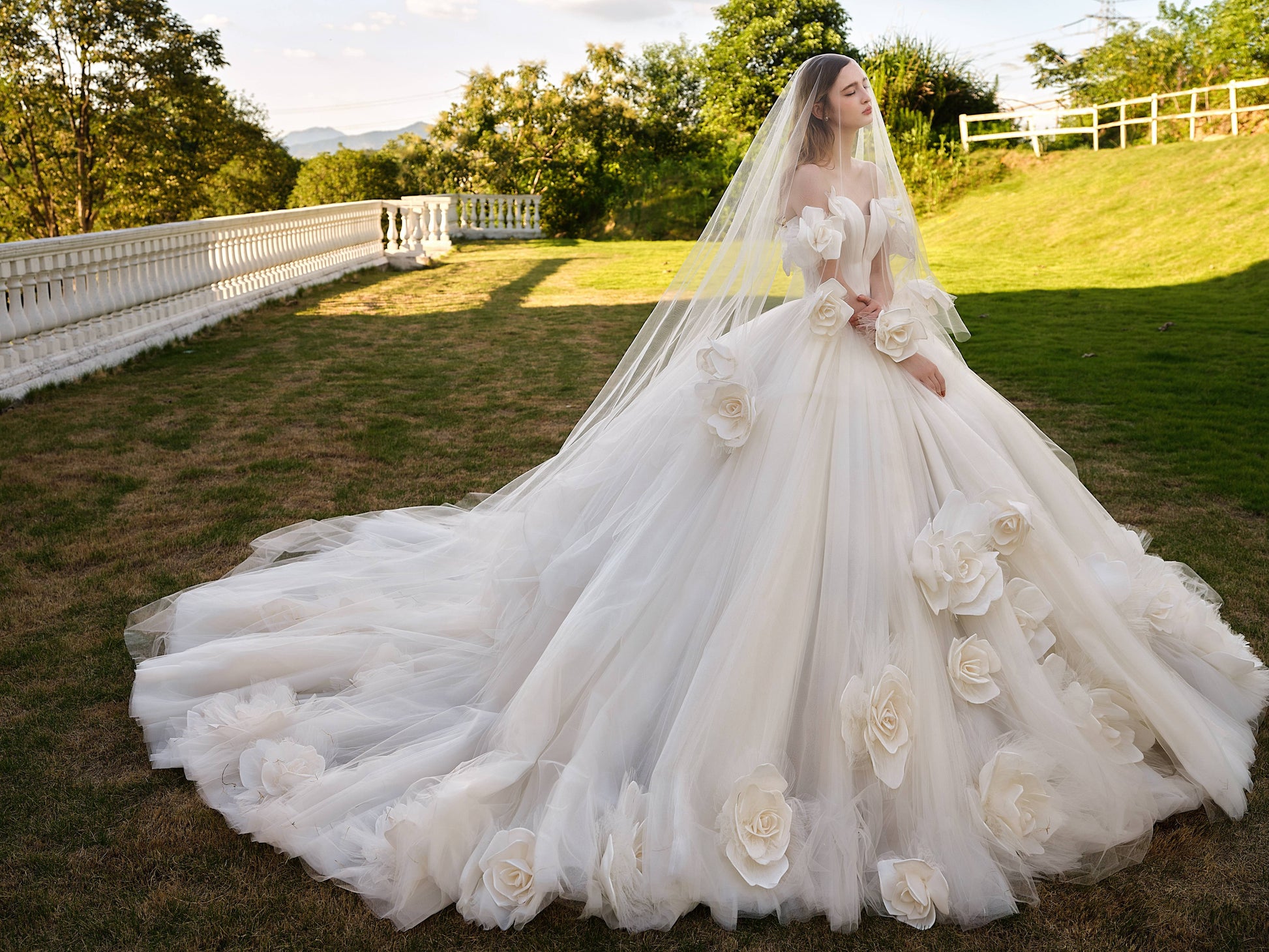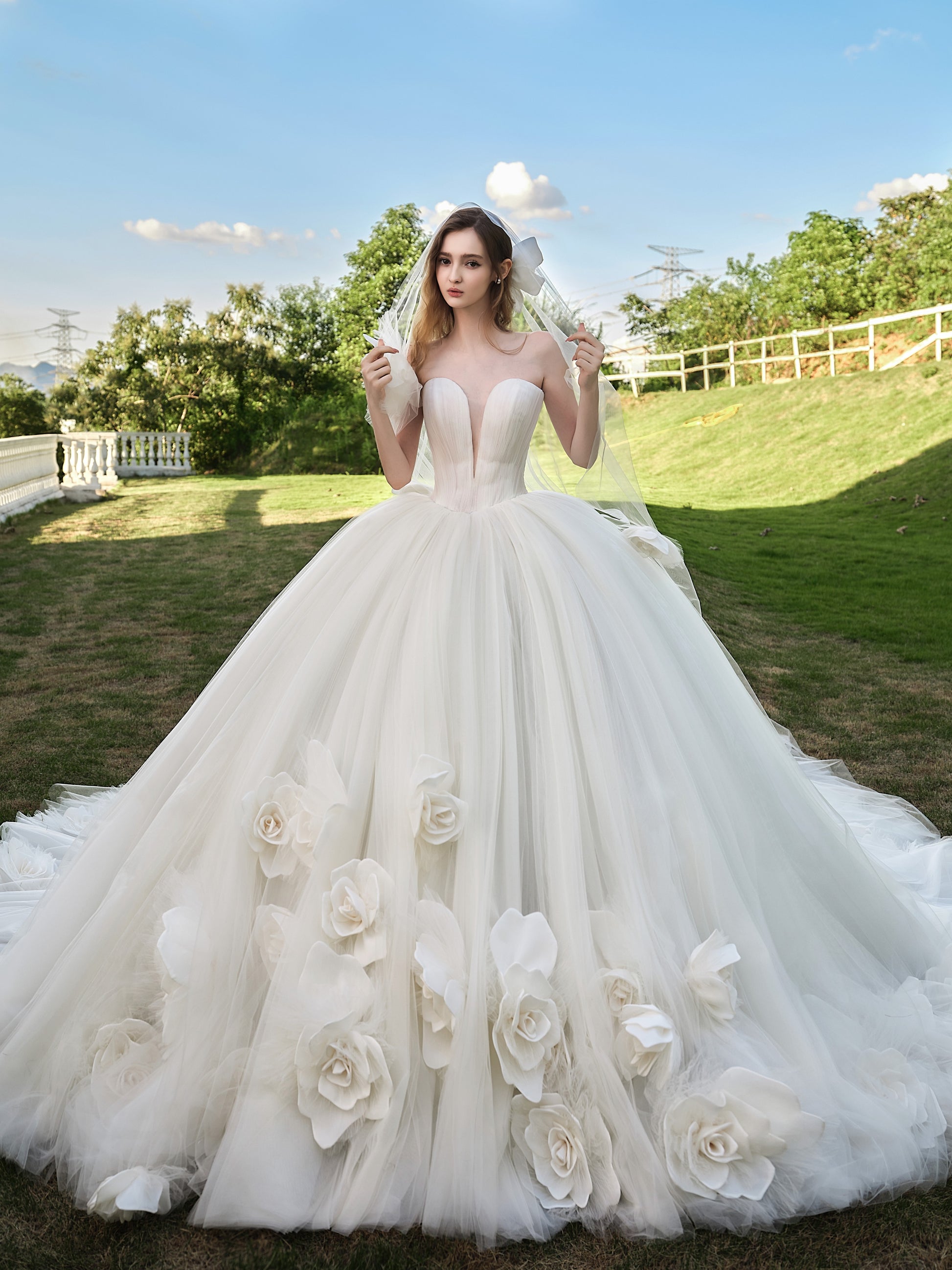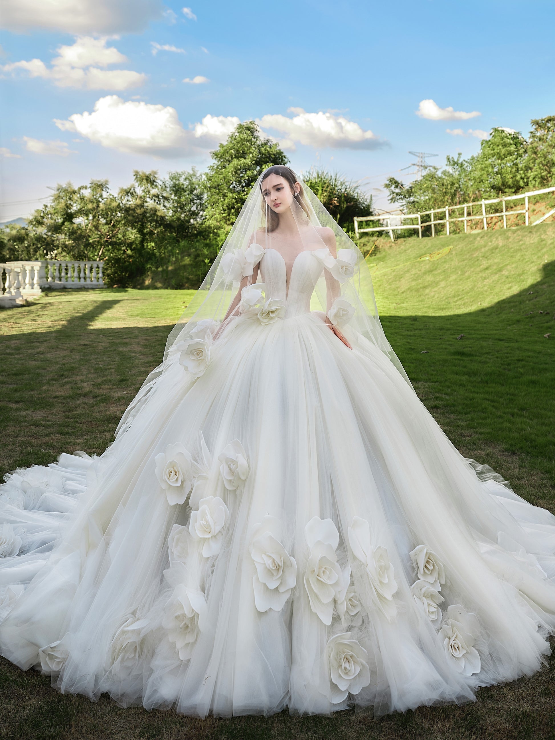 The sculpted sweetheart bodice flows seamlessly into layers of airy tulle, light as a summer breeze. 🍃 The skirt blooms with delicate ivory roses, each petal whispering of love stories timeless as the city itself. 🌹🏰