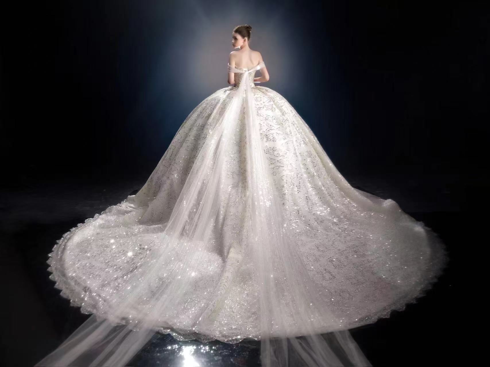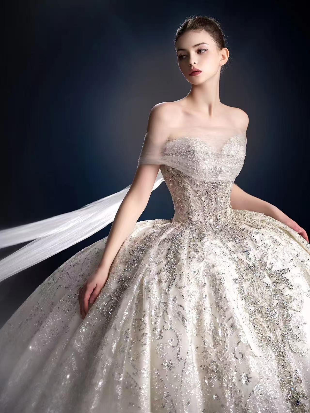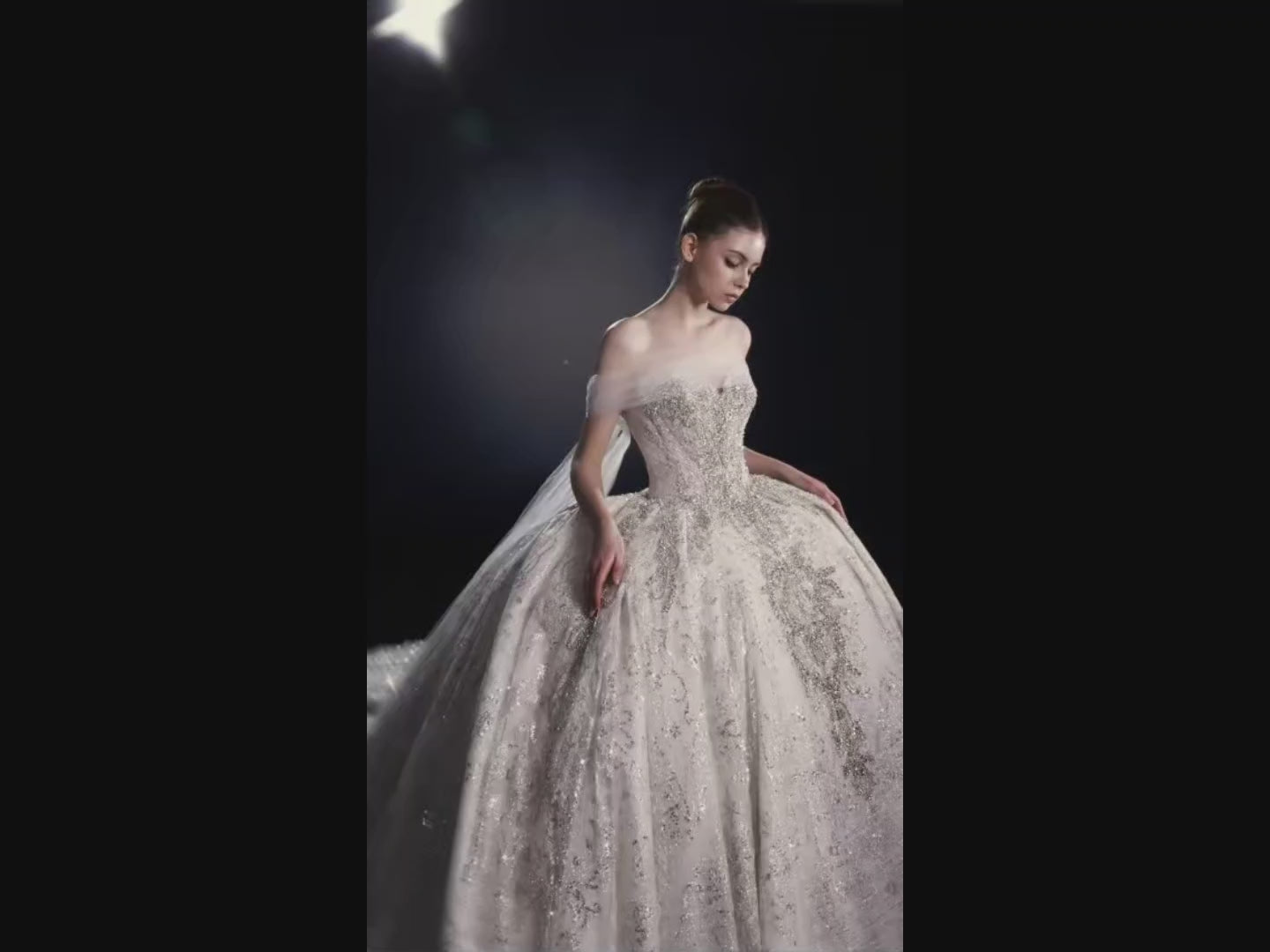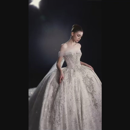 This off-shoulder ball gown features an illusion tulle neckline 🌸 that softly frames the shoulders, flowing into a corset-style bodice hand-adorned with crystals 💠, sparkling sequins ✨, and delicate silver-thread embroidery 🪡. Like a secret told in starlight, every detail of "Whisper" shimmers with elegance.